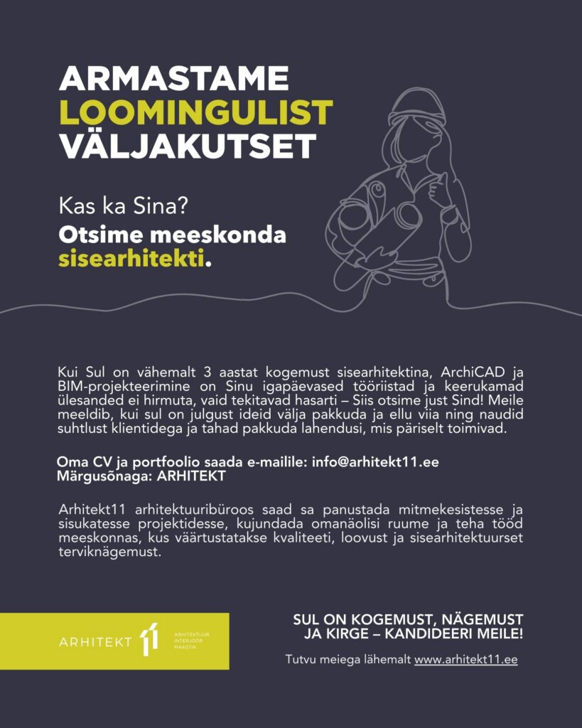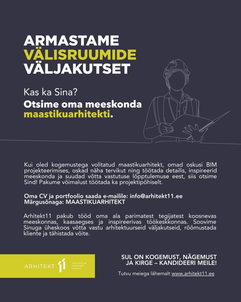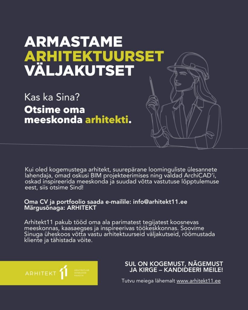 Arhitekt11 tiim laieneb. Ootame enda sekka arhitekti, sisearhitekti ja maastikuarhitekti – inimesi, kes tahavad luua ruume, mis panevad peatuma ja mõtlema ning mis püsivad ajas. Meie töölaua ääres on just Sinu jaoks veel üks koht.