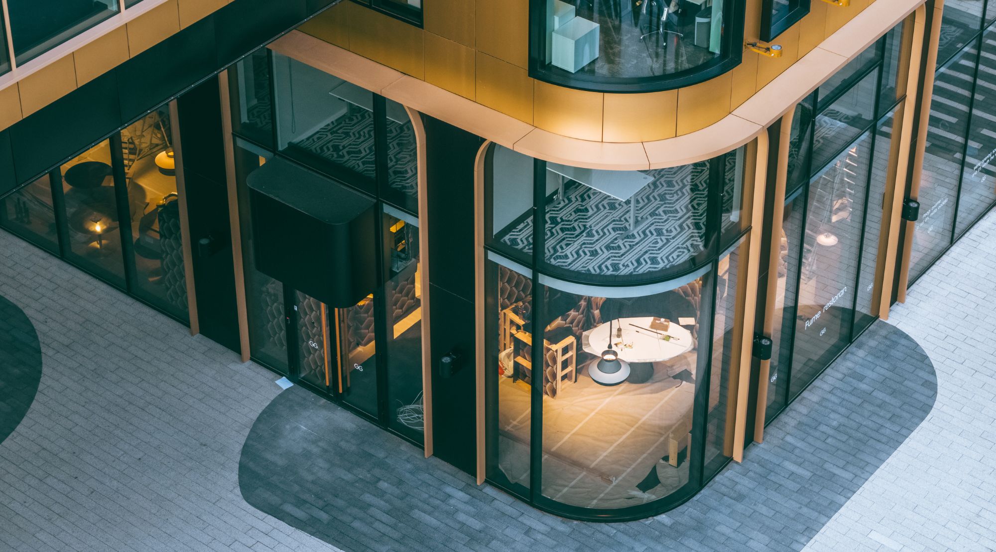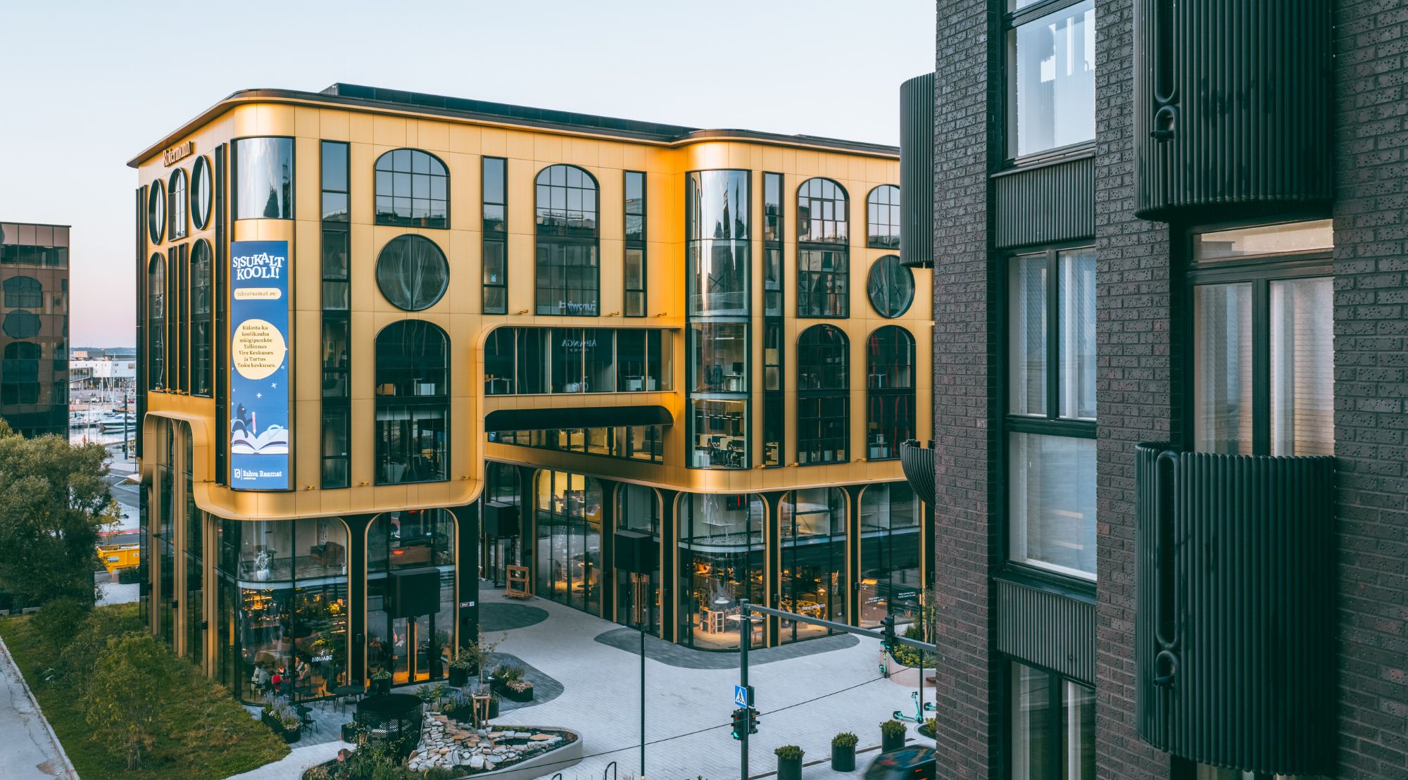 The six-storey building above ground and two underground floors tells the story of how to respect the past while creating a completely modern space. While preserving the authentic heart of the old limestone building, we are building a new architecture around it with a gold and black facade that respects history but does not remain a prisoner of it. The result is a LEED-certified building that offers space for both retail and office space, while creating a passageway that connects the Rotermann Quarter with the waterfront areas.