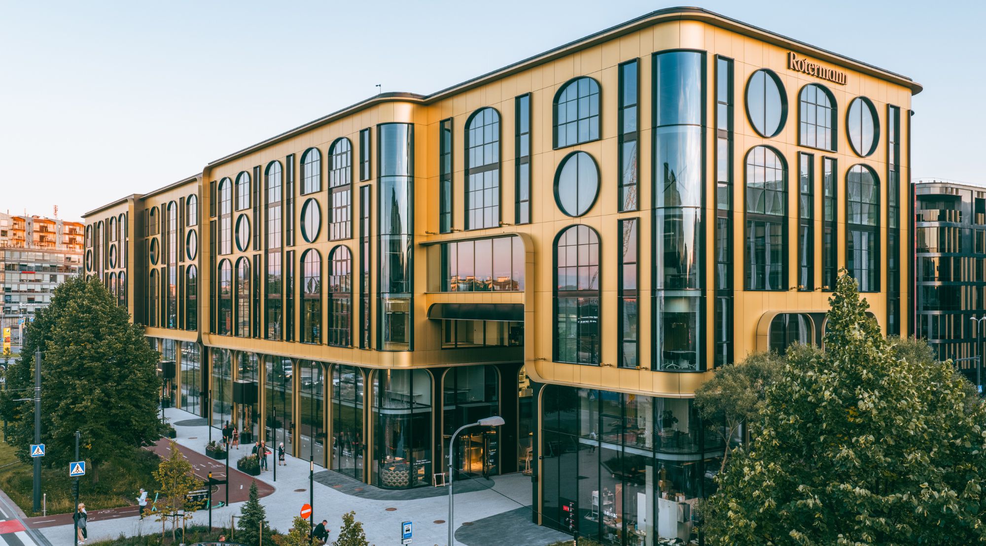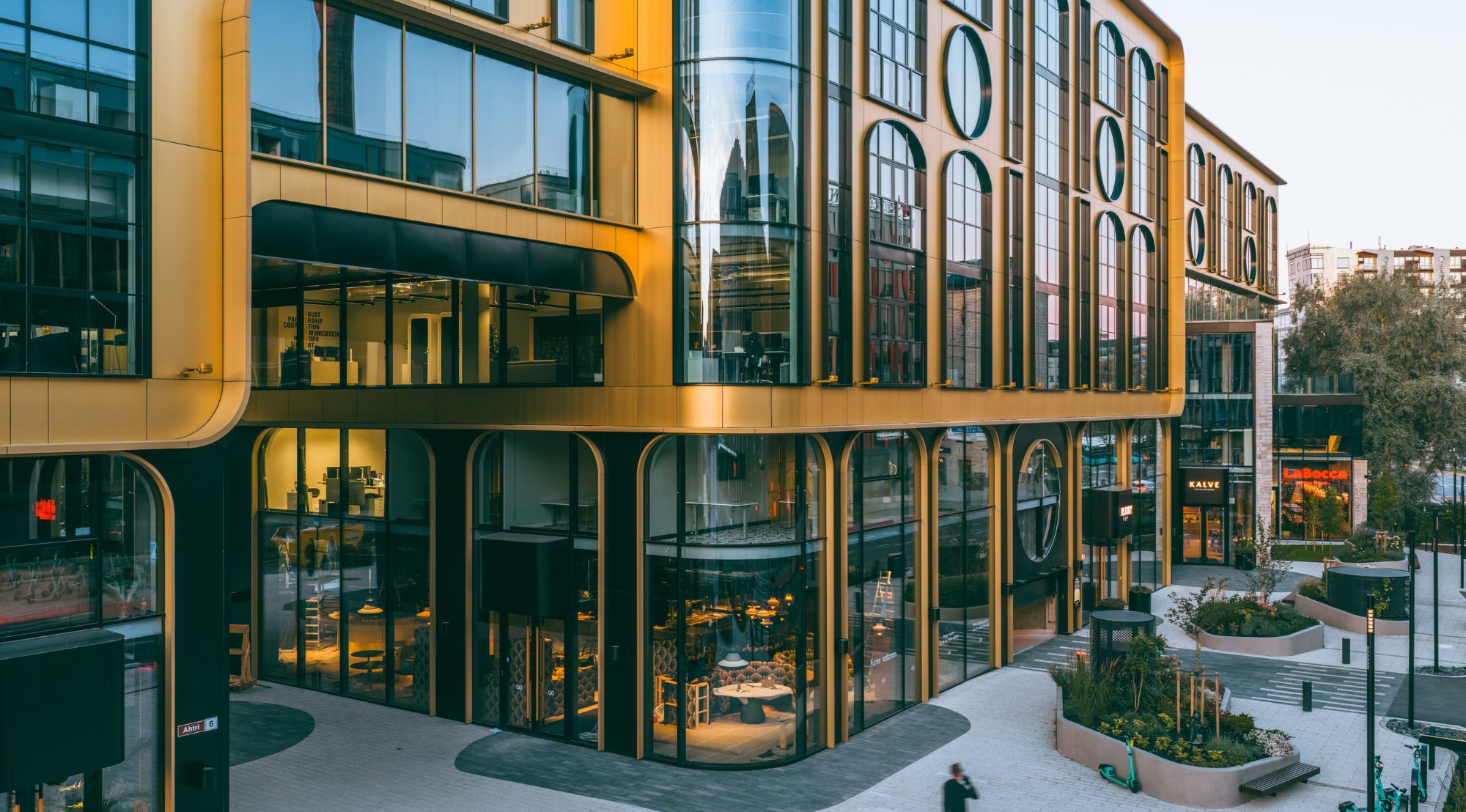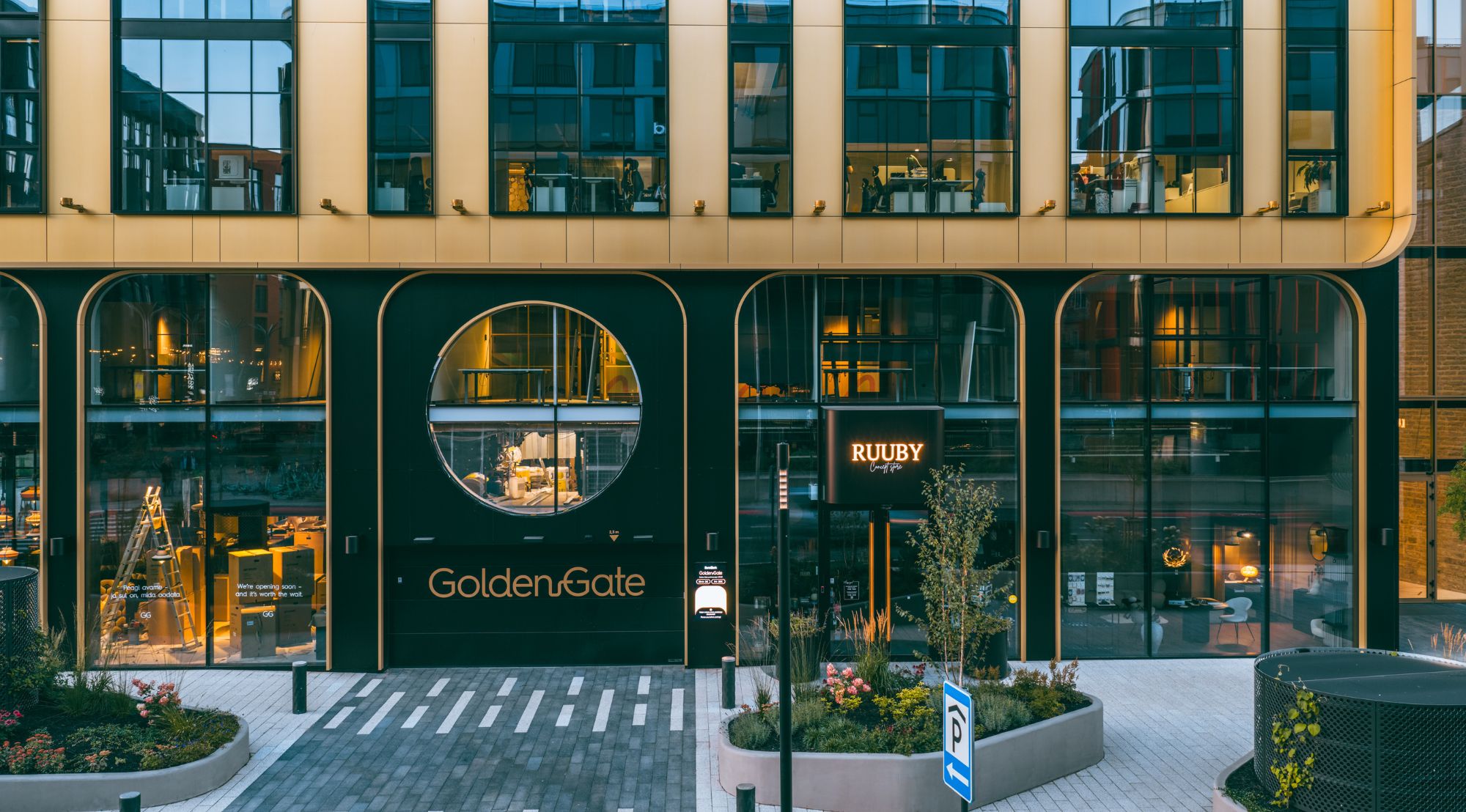 The architectural identity of Golden Gate is born in an elegant dialogue of gold and black. The lower two floors of the building are clad in dark brown anodized aluminum, creating a visually airy colonnade that supports the golden superstructure. Starting from the third floor, the façade opens up a pattern of alternating round windows and narrow window mullions that plays with light and shadow throughout the day.
