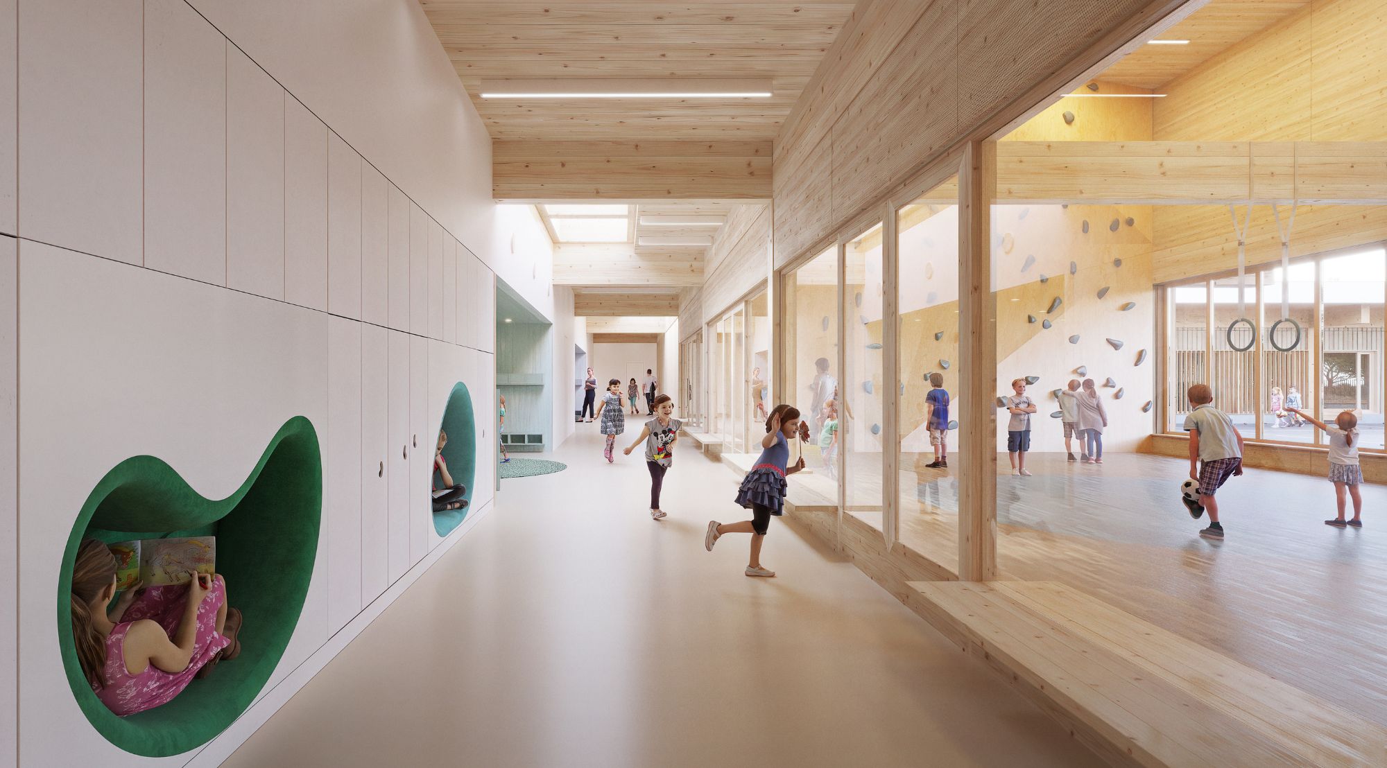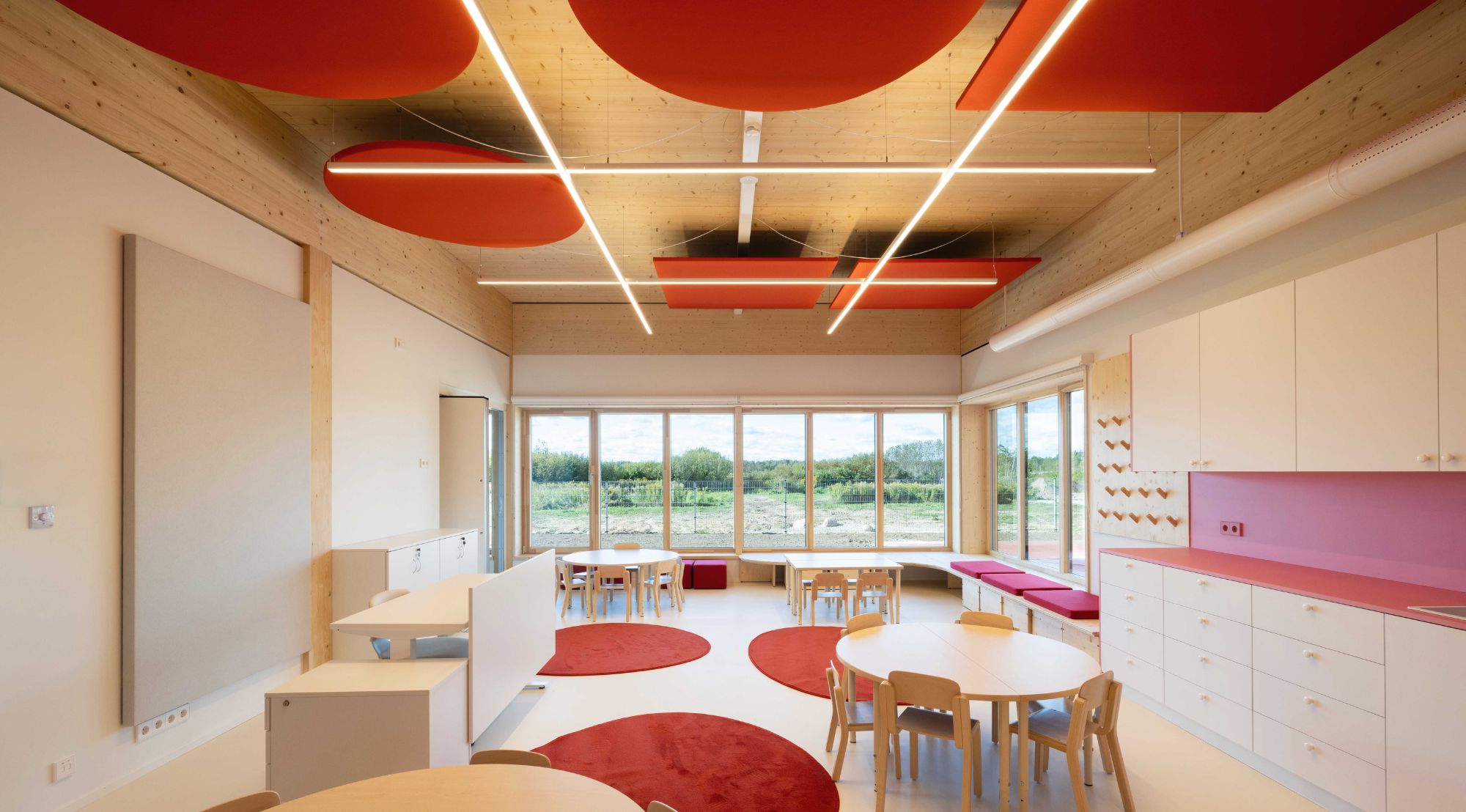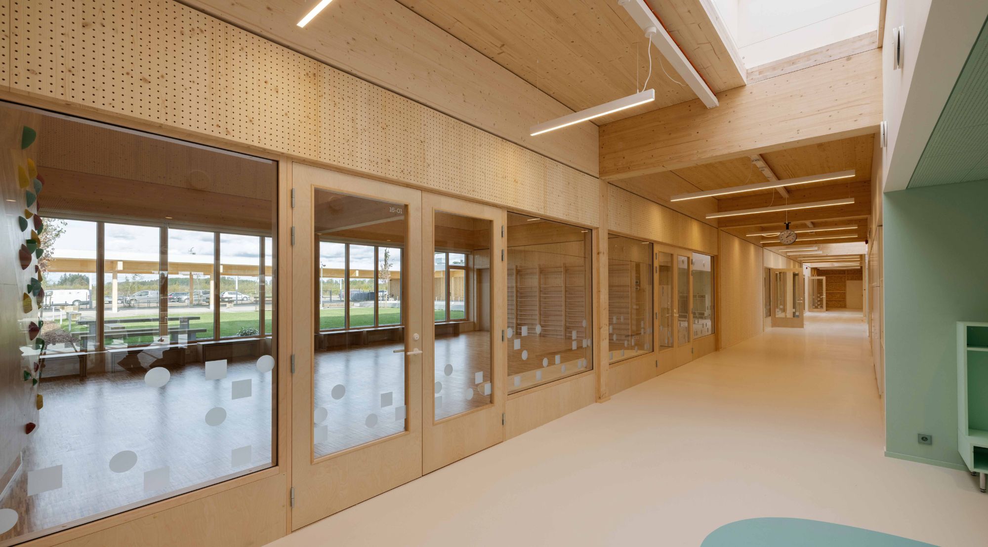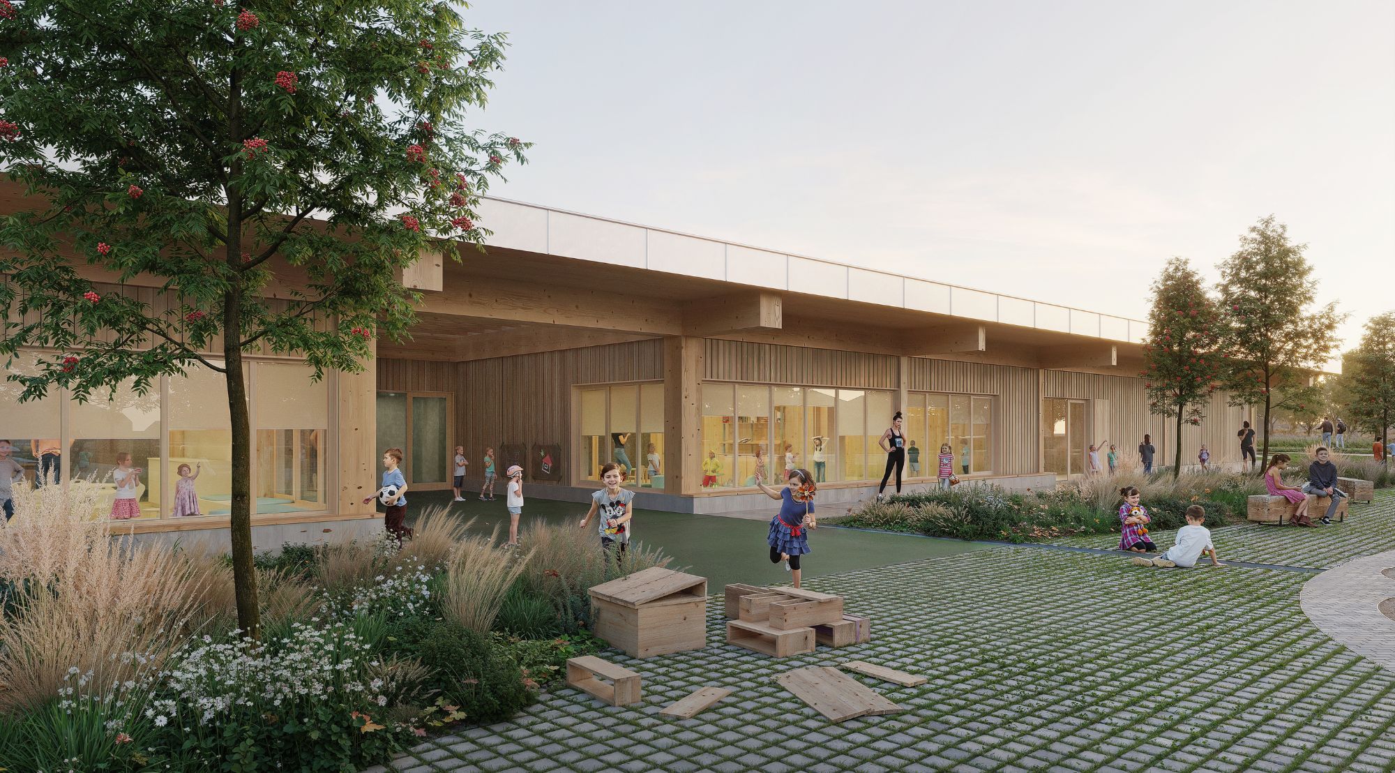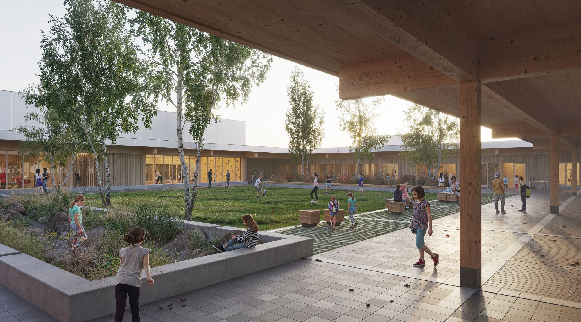 The heart of our concept was the idea that the learning environment does not end with the classroom walls, but expands through winter gardens and large glass surfaces directly into nature. The CLT timber structure on a regular 8×6 metre grid created a structure that allows the buildings and the landscape to develop together – like a living system that adapts to changing times and needs. The outdoor space became a natural extension of the classrooms, where children can learn both indoors and between the ditches, woodland and garden areas.