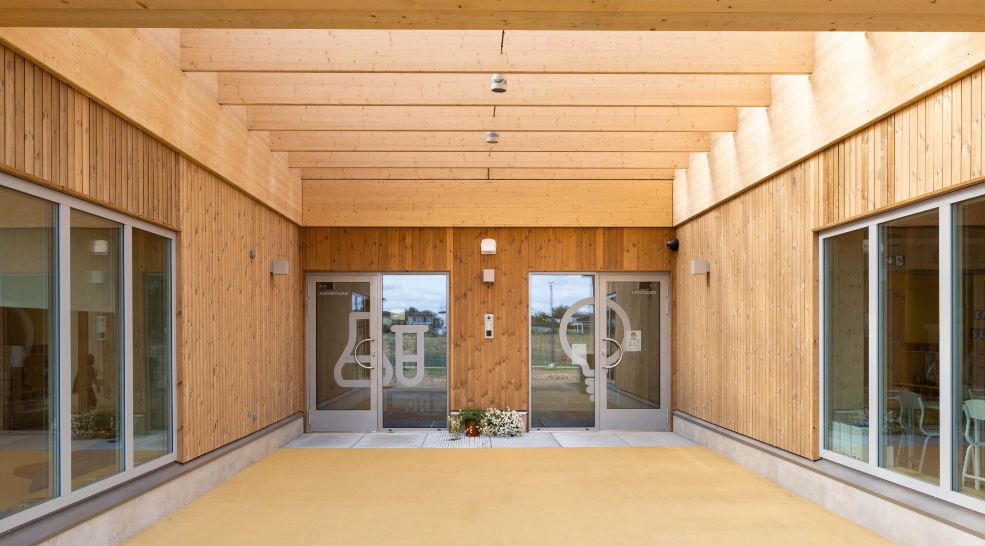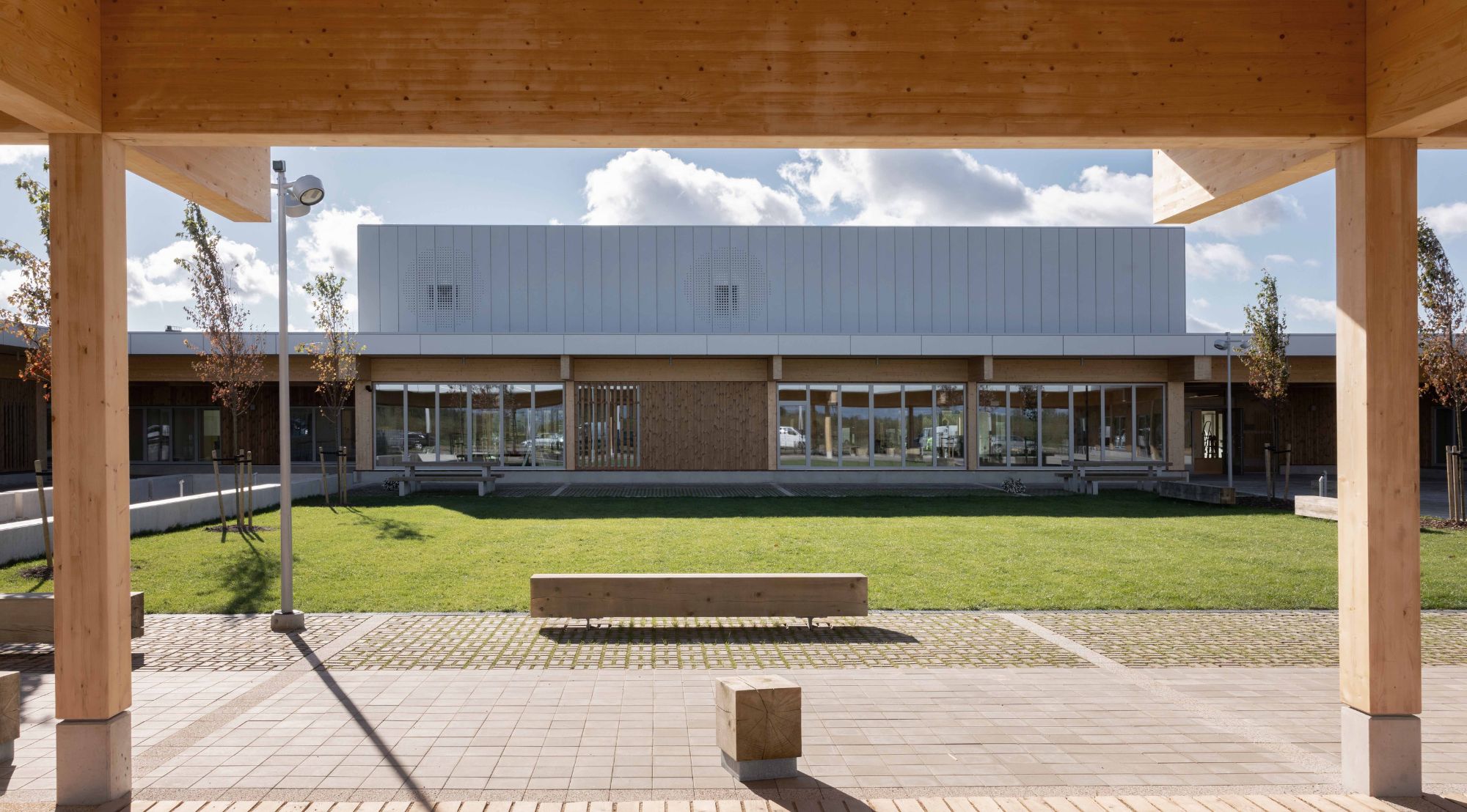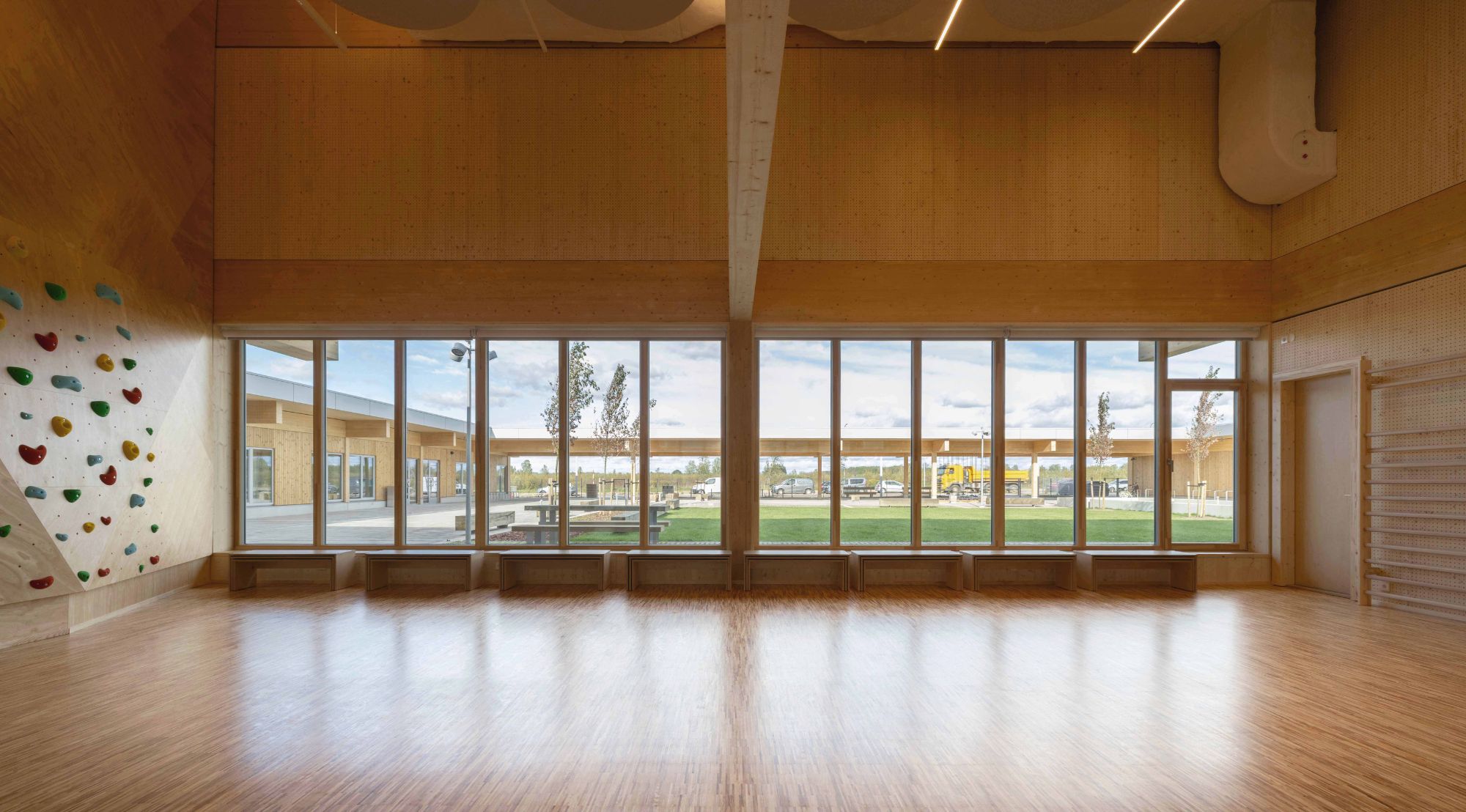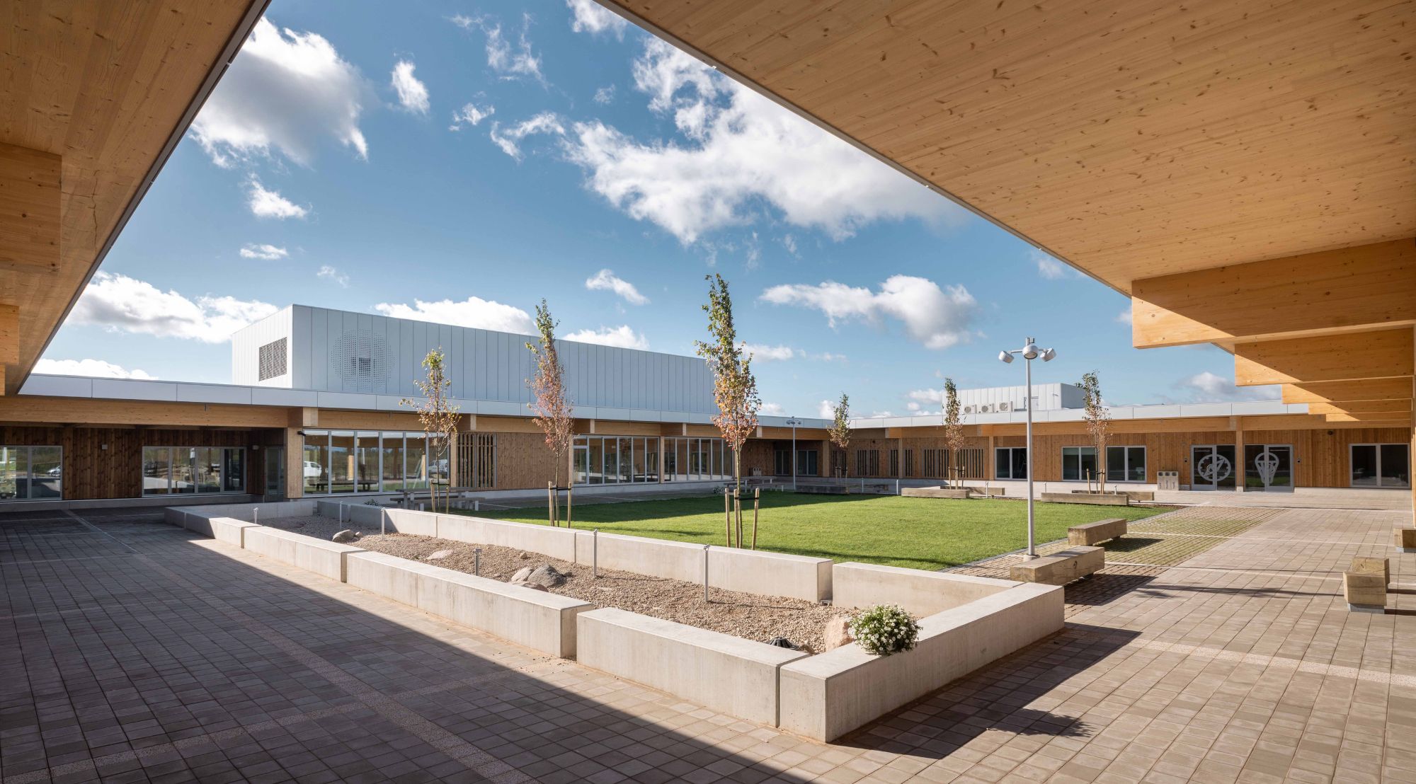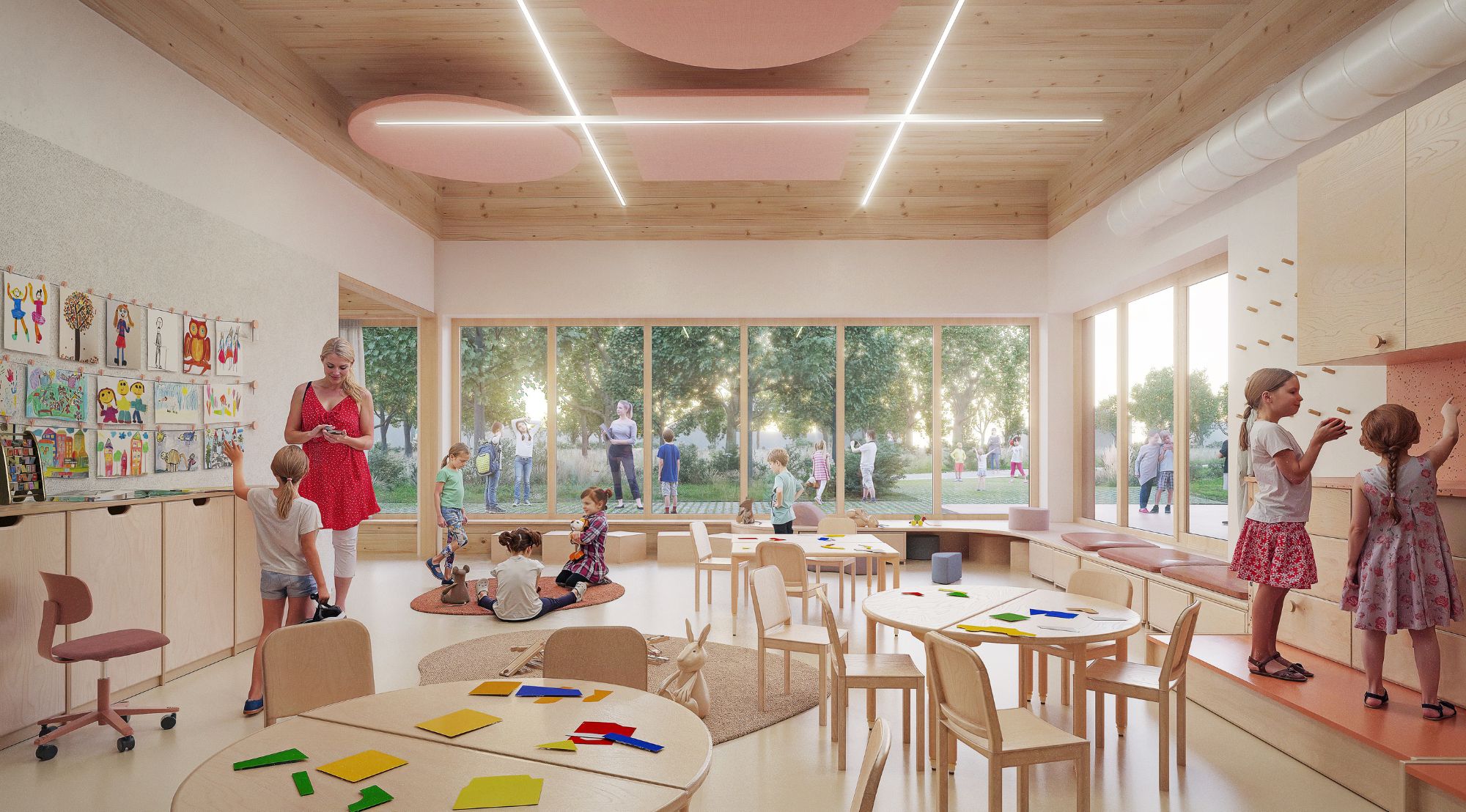 The heart of our concept was the idea that the learning environment does not end with the classroom walls, but expands through winter gardens and large glass surfaces directly into nature. The CLT timber structure on a regular 8×6 metre grid created a structure that allows the buildings and the landscape to develop together – like a living system that adapts to changing times and needs. The outdoor space became a natural extension of the classrooms, where children can learn both indoors and between the ditches, woodland and garden areas.