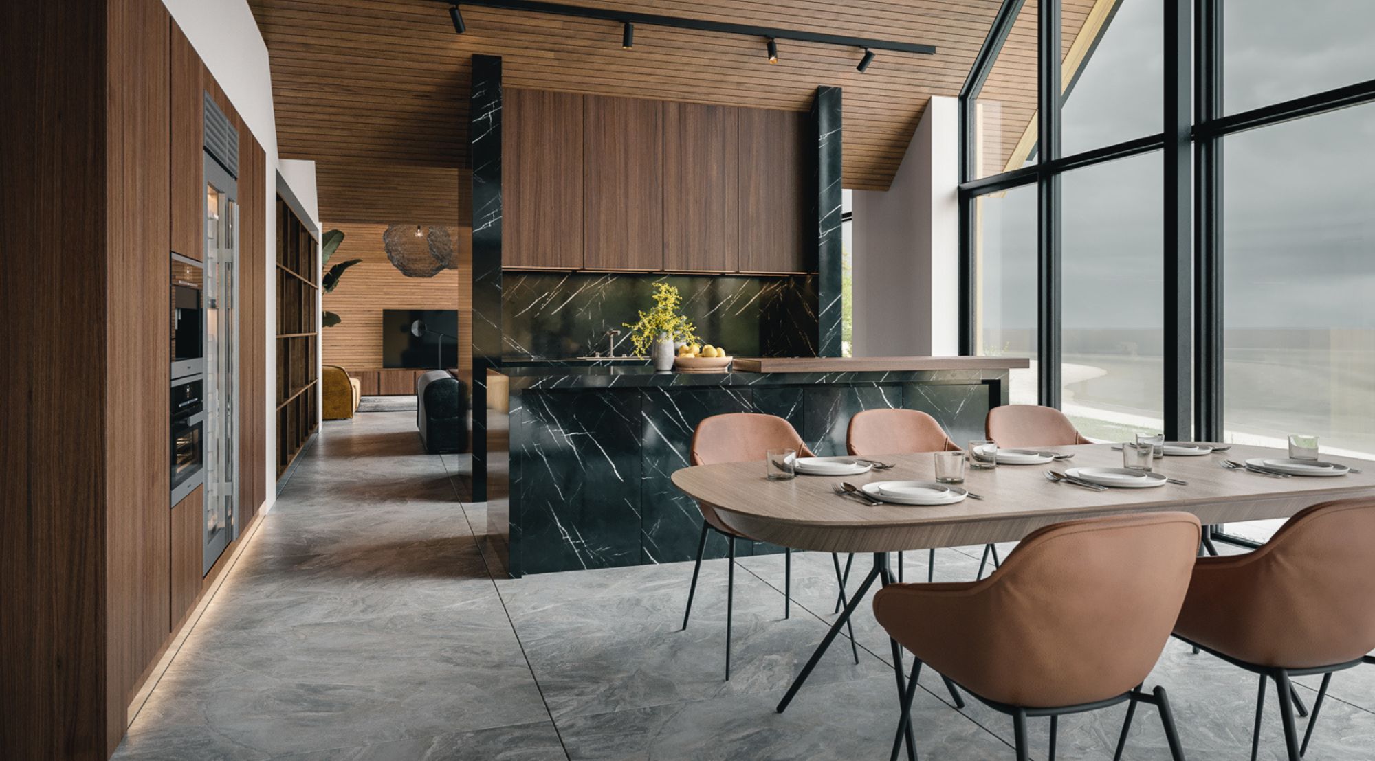 Sisemuses räägib iga detail mere lähedusest. Tumehall marmor meenutab merevaigustamist, naturaalse puu soojus tasakaalustab klaasi ja kivi jahedust, samas kui avatud planeering laseb merel vabalt sisse voolata. Tulemuseks on kodu, kus mere rütm saab igapäevase elu taktimõõduks – rahulik, kuid samas dünaamiline, ajatu, kuid elav.