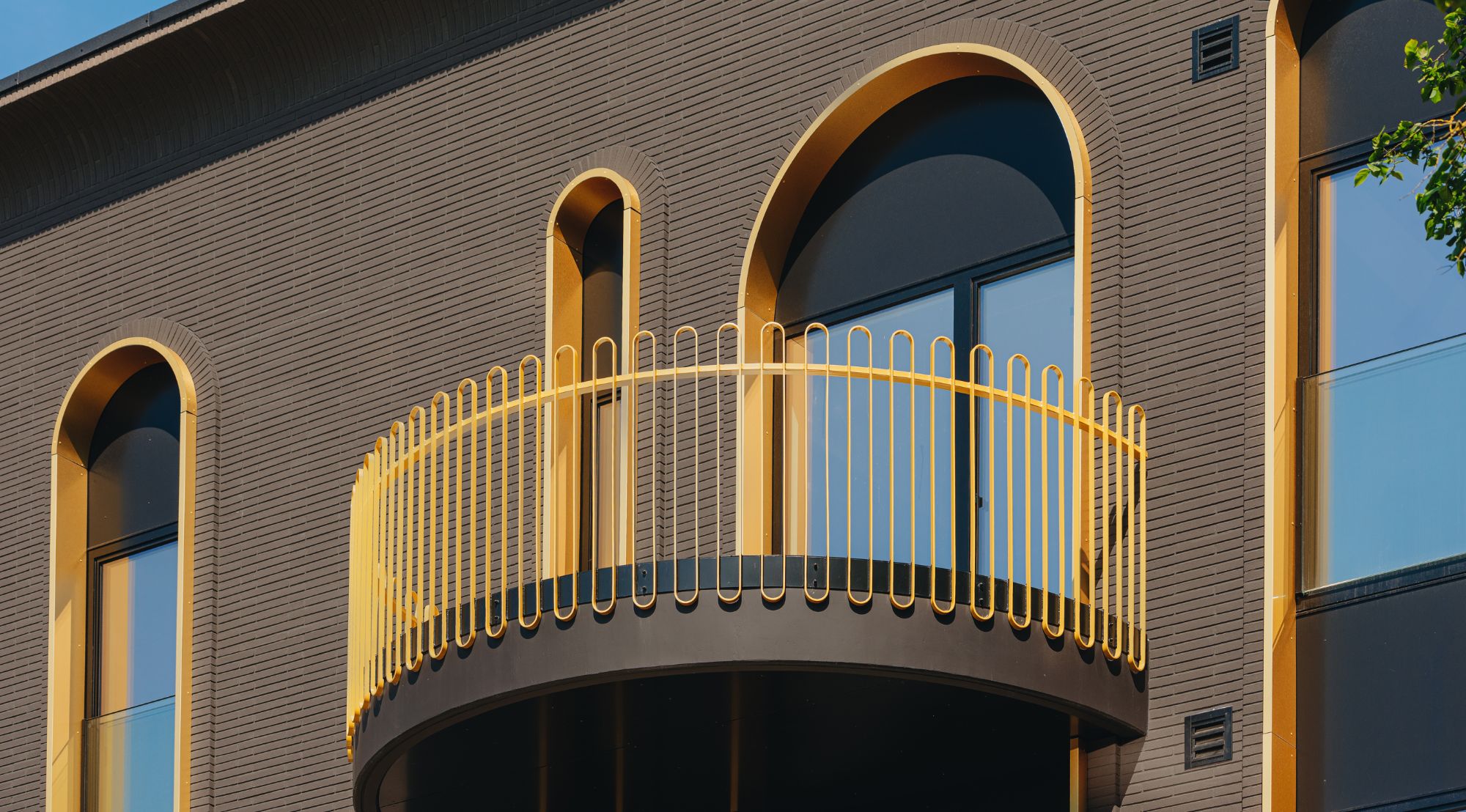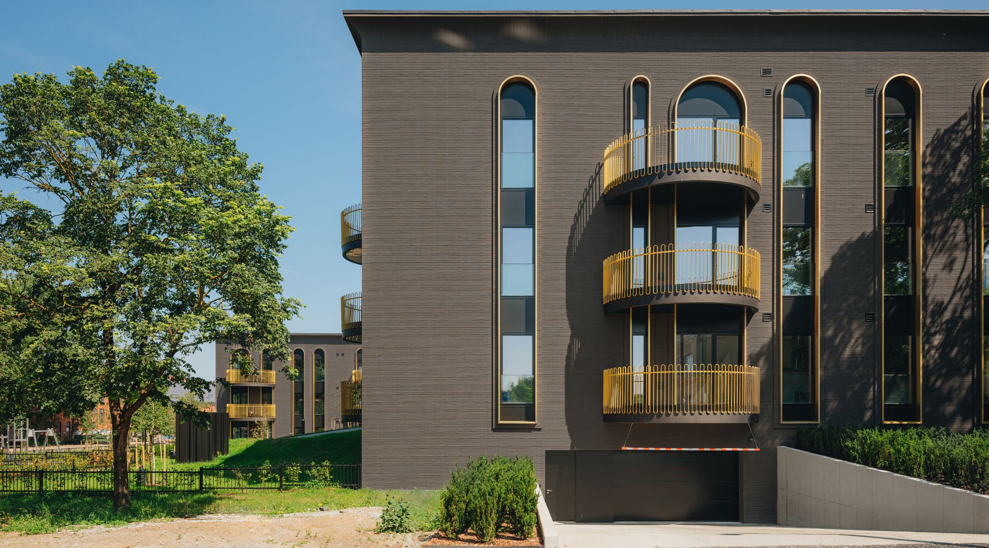Fassaadikattematerjaliks on soojustusele kleebita mustjas-hall põletatud tellis Felhaus-Klinker. Akende ümber on eenduvad vormid, mis sama kiviga kaetud. Akende põsed on raamitud messinguga kaetud komposiitplaadist valtsitud raamidega.