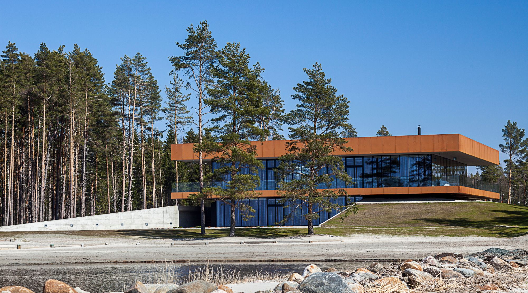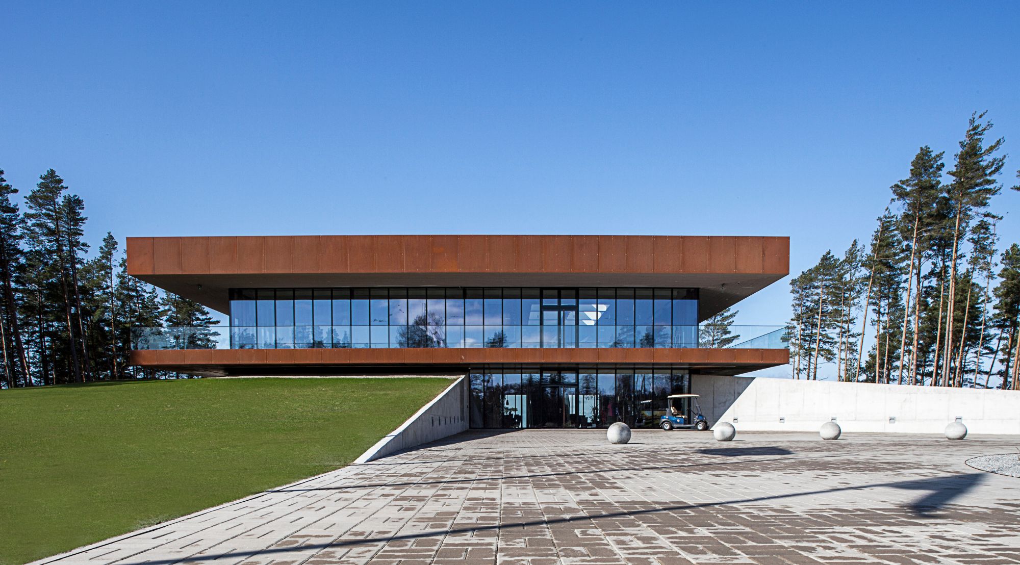 Meie lahendus tugines hoone ja maastiku orgaanilisele dialoogile. Korten-terasest välispind sulandub looduslikult rannaliiva ja männimetsa keskkonnaga, samal ajal kui kahekorruseline klaaskast avab panoraamivaated igas suunas. Siseruumides räägib iga detail golfi ja mere loost – geomeetrilised laekasseti vormid meenutavad linksirajale iseloomulike liivaaukude kujundust.