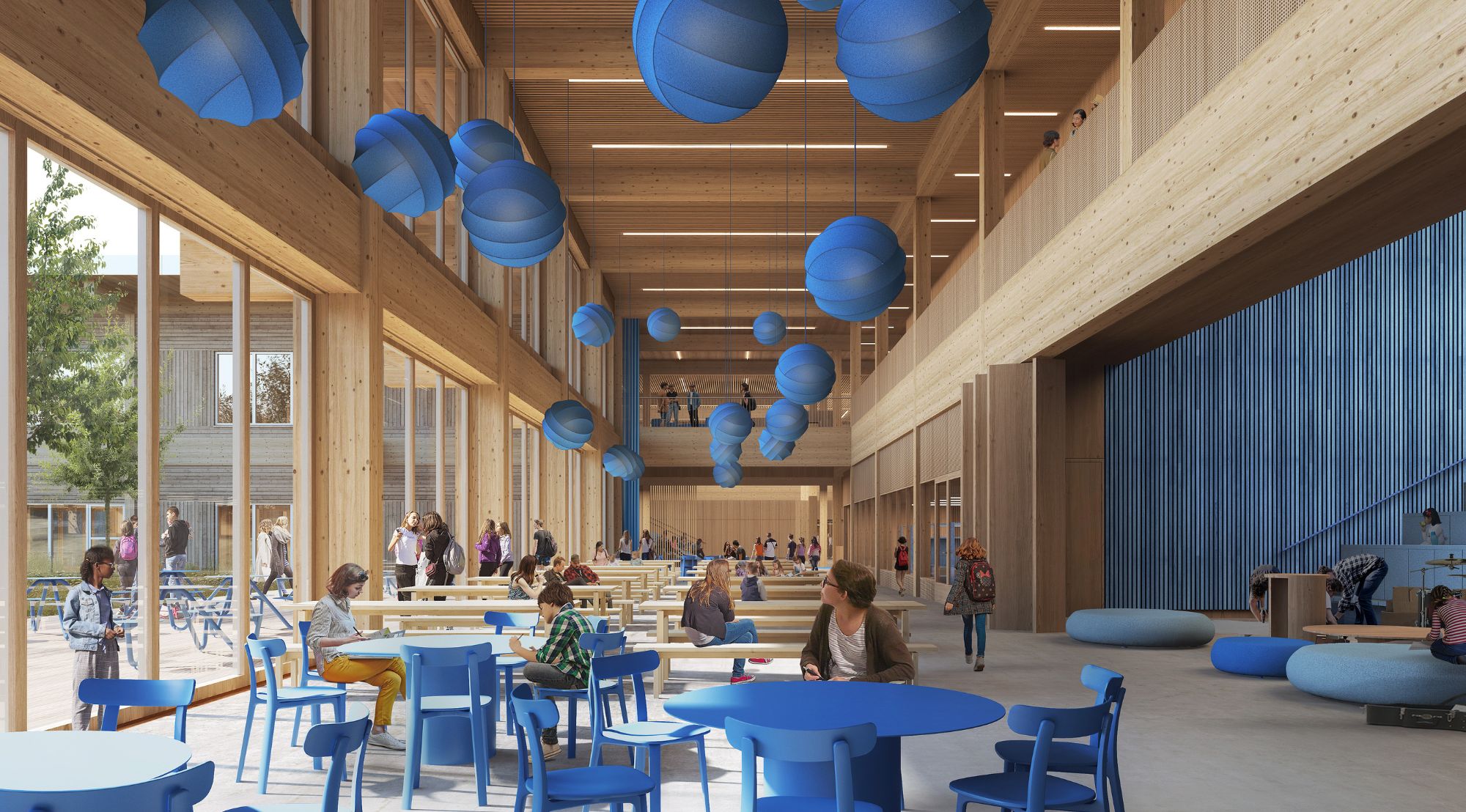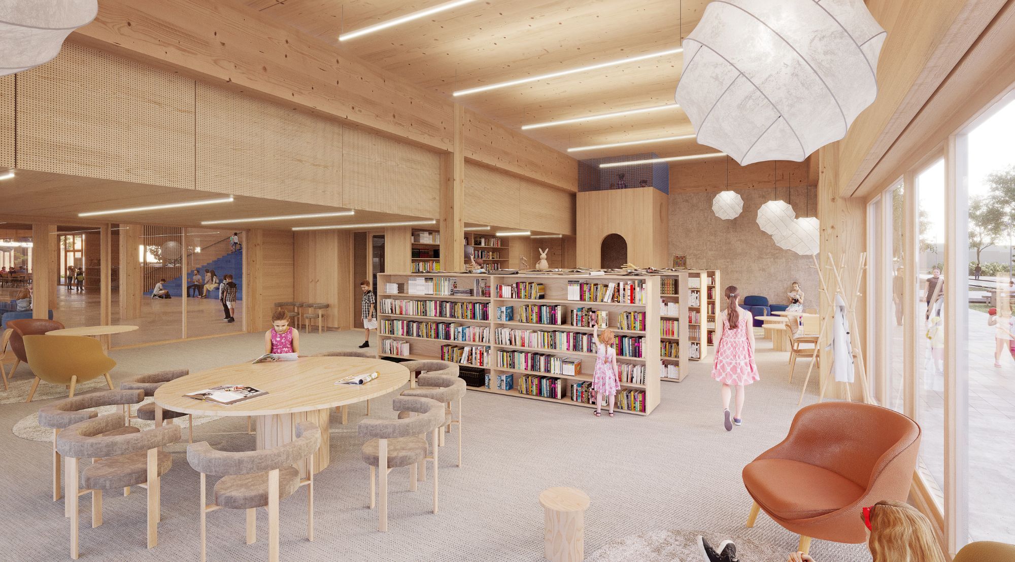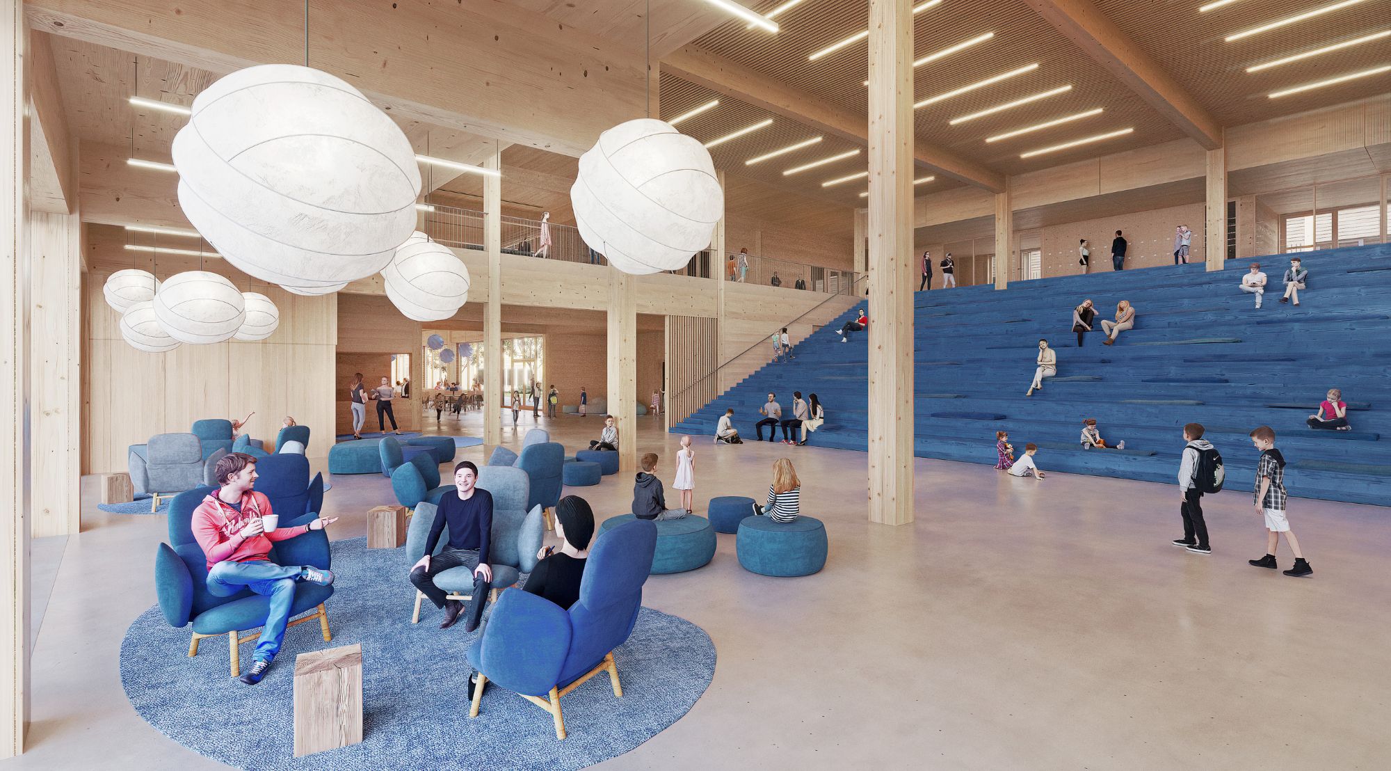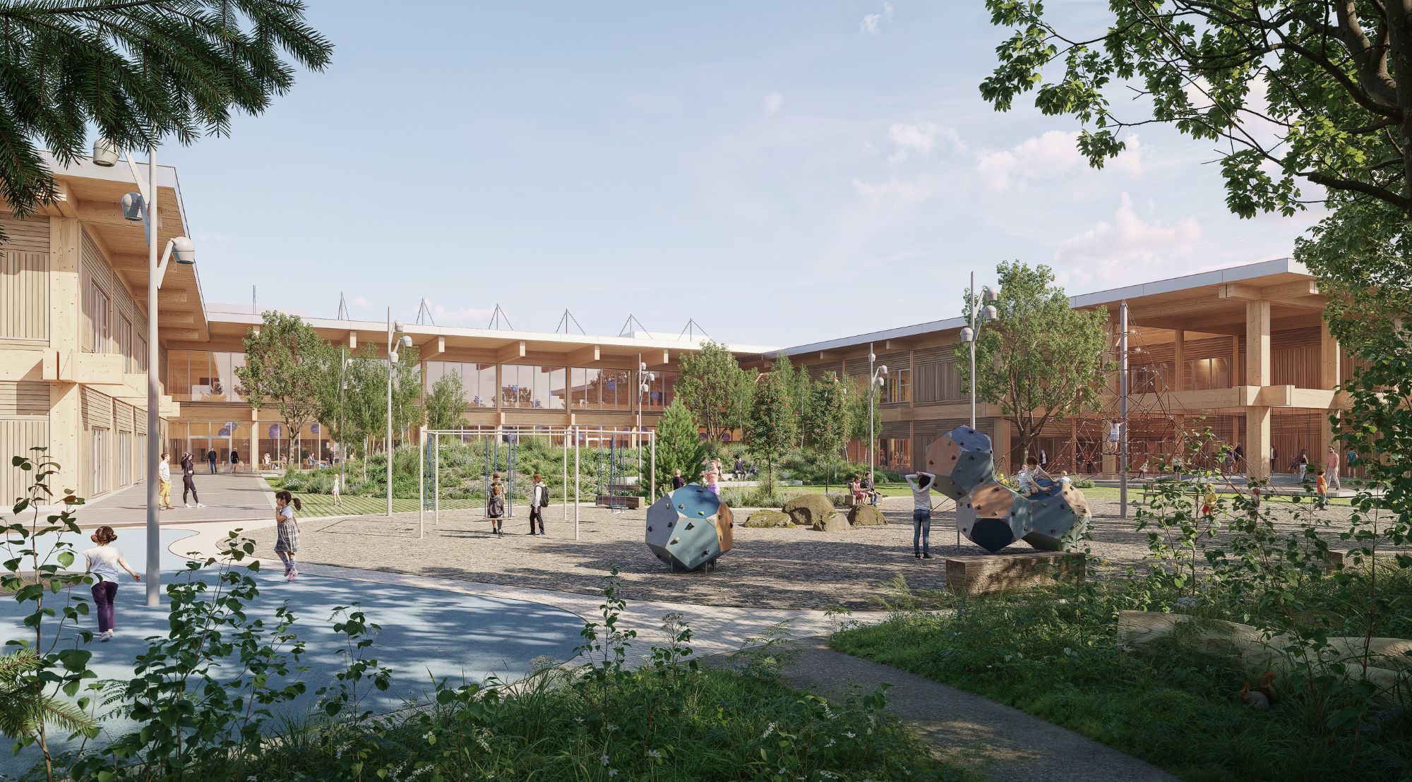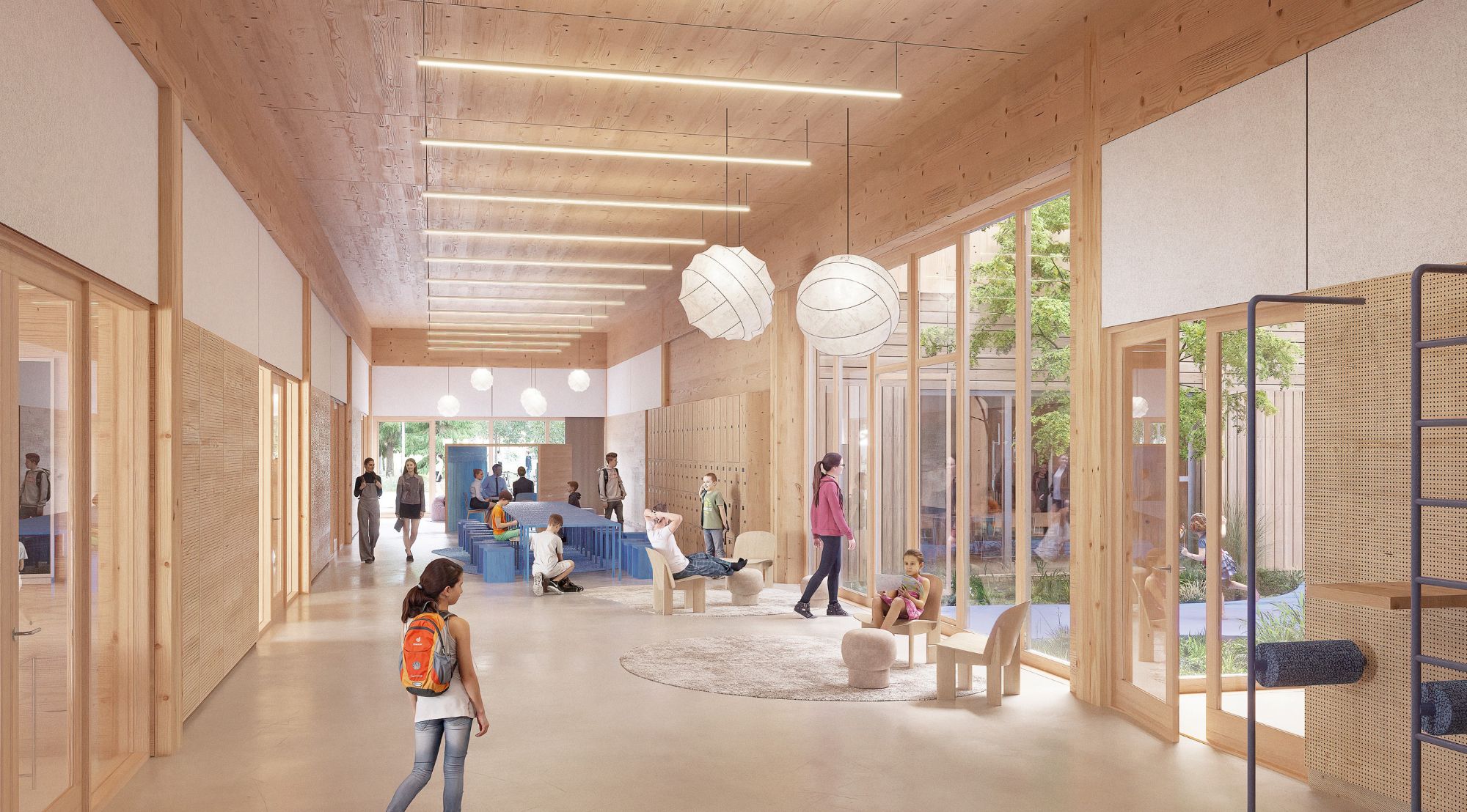 Meie kontseptsiooni südameks sai mõte, et õpikeskkond ei lõppe klassiruumi seintega, vaid laieneb läbi talveaedade ja suurte klaaspindade otse loodusesse. CLT puitkonstruktsioon 8×6 meetri regulaarsel võrgustikul lõi struktuuri, mis võimaldab hoonete ja maastiku koos arenemist – nagu elav süsteem, mis kohaneb aja ja vajaduste muutumisega. Väliruum muutus õpperuumide loomulikuks pikenduseks, kus lapsed saavad õppida nii siseruumides kui ka kraavide, metsaalade ja aianduspiirkondade vahel.