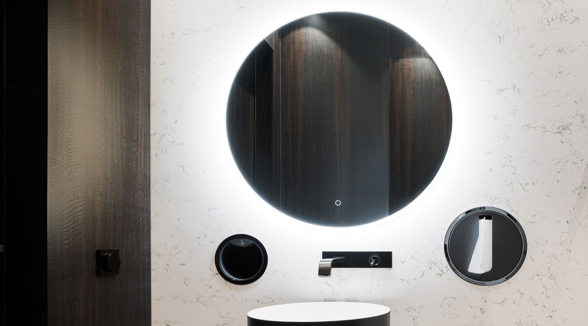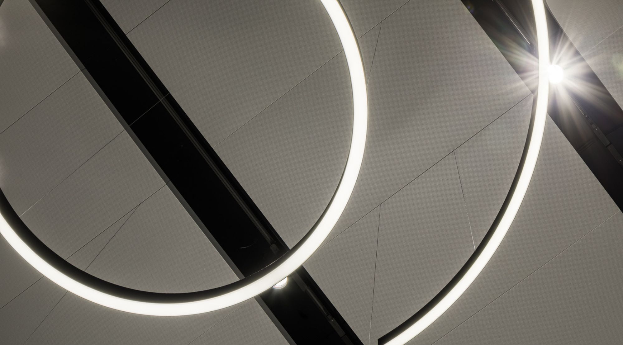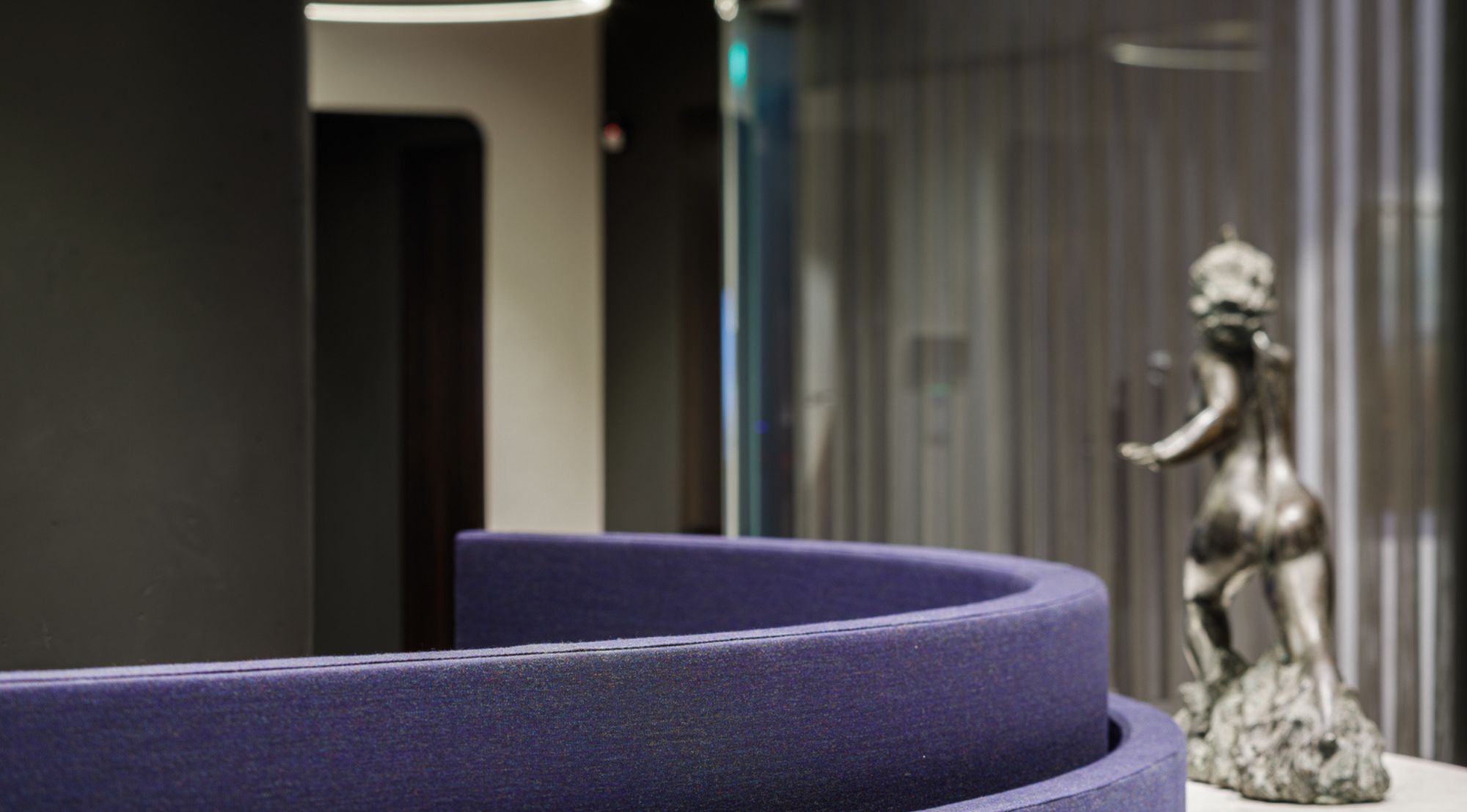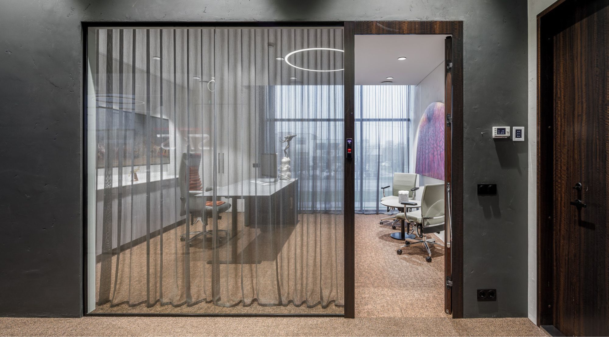 Kaasaegne kontoriala pakub optimaalset töökeskkonda avatud planeeringuga ruumis, kus hoolikalt planeeritud valgustus ja akustiline mugavus tagavad produktiivse tööõhkkonna. Lineaarsed LED-valgustid laes loovad puhtaid jooni ja tagavad ühtlase valguse jaotuse. Privaatsed konverentsiruumid on varustatud kõrgkvaliteetsete materjalidega – eksponeeritud betooniseinad annavad industriaalse puhtuse, samas kui soojad tekstiilpinnad lisavad akustilist mugavust. Ümmargused valgusrõngad loovad dünaamilist atmosfääri ja toimivad ruumi fokaalpunktina. Premium kliendivastuvõtu ala demonstreerib ettevõtte staatust läbi kvaliteetsete materjalide ja hoolikalt valitud kunstiteoste.