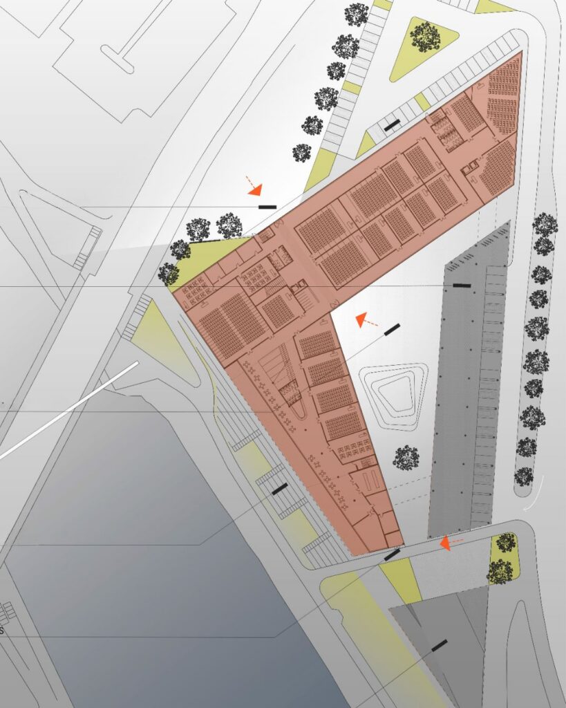 Hoone paiknemine püüab ehitusala piires maksimaalselt ära kasutada jõeäärset fronti, ning murdub Vabaduse sillani jõudes täisnurkselt krundi sisse, moodustades avara väljaku, mis võimaldab suure hulga inimeste liikumist, väiksemate väliürituste ja väliekspositsioonide korraldamiseks.